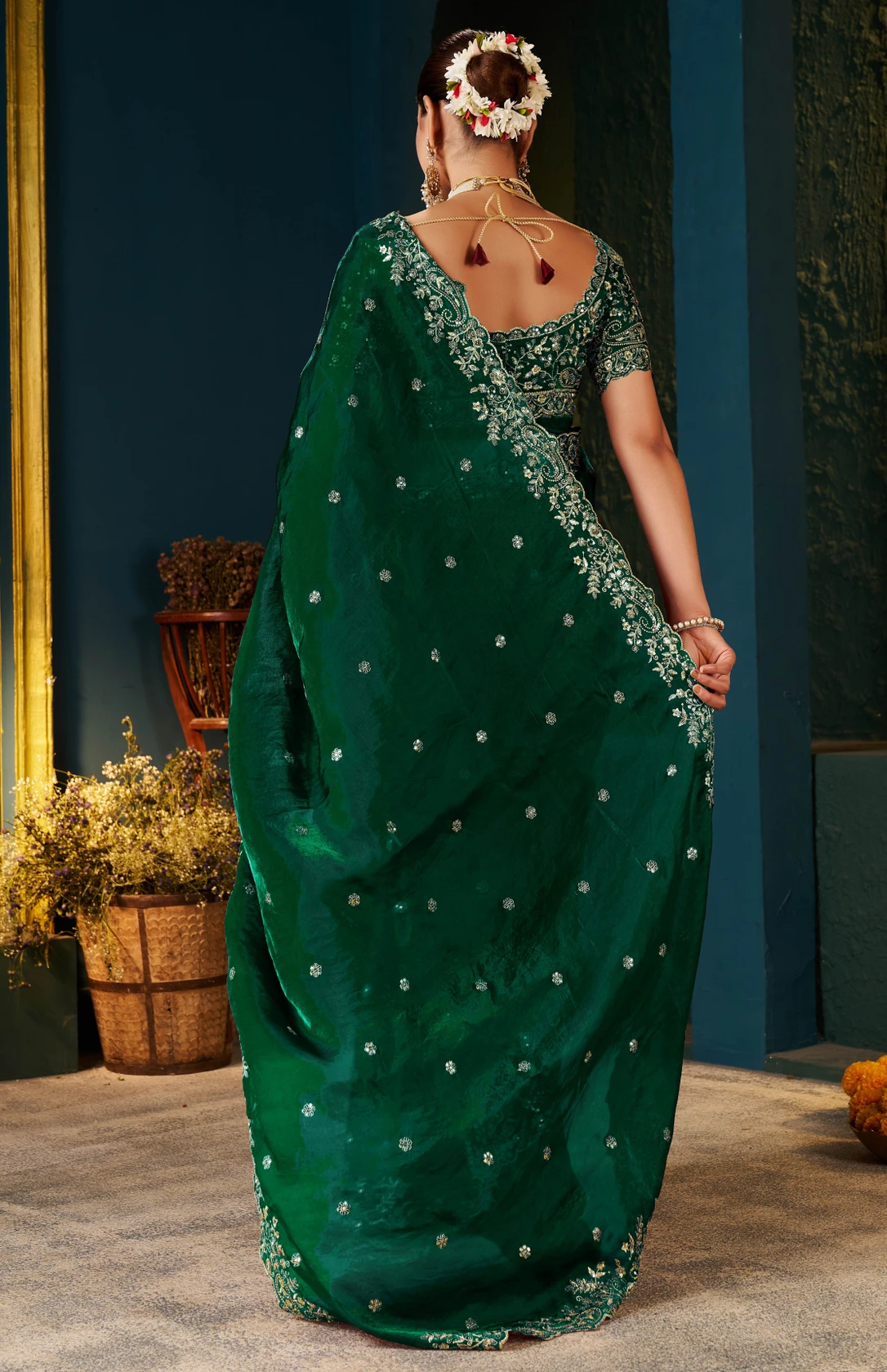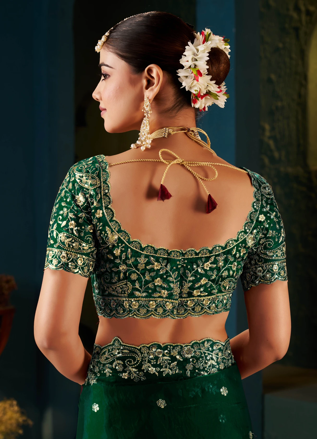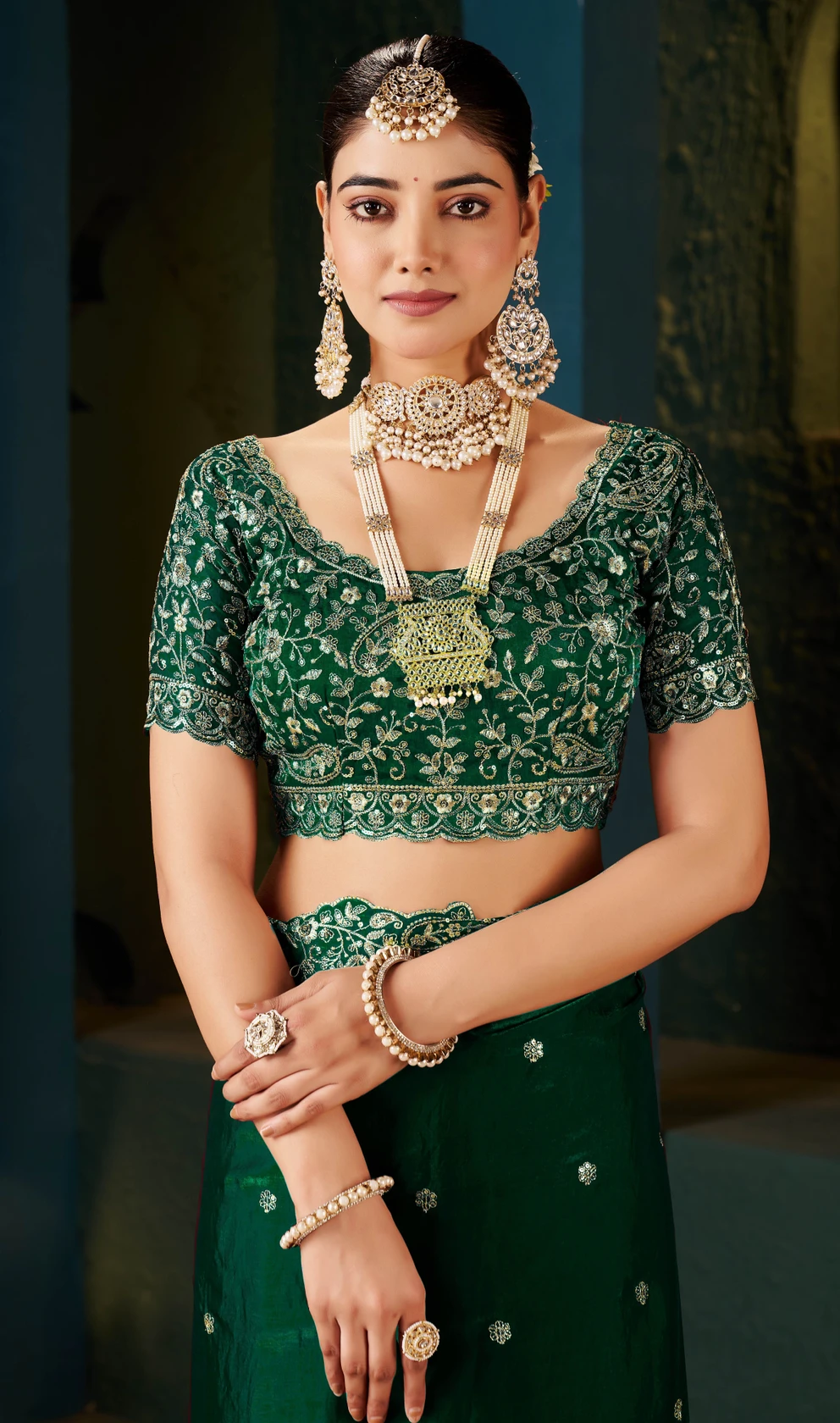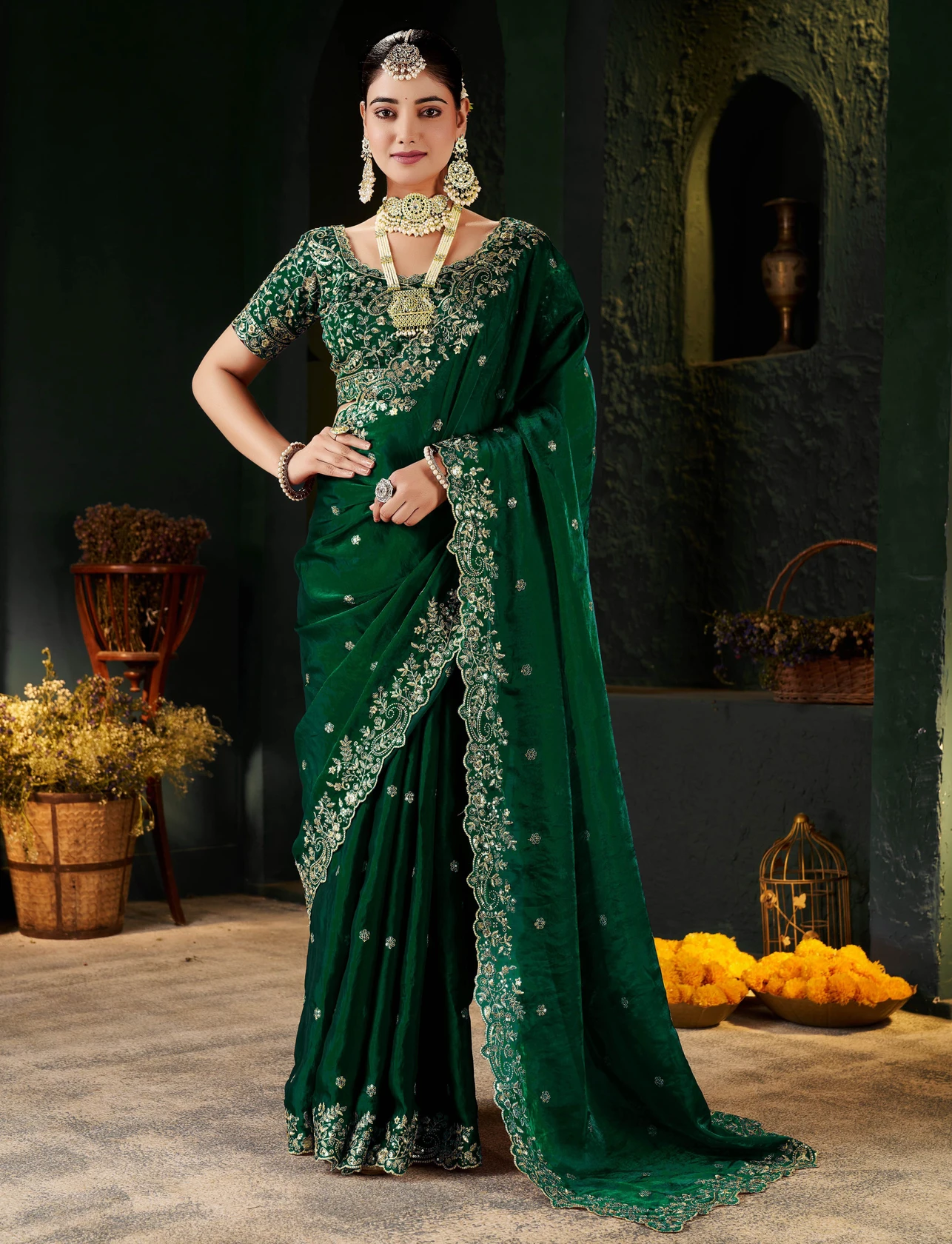 Explore The Collection Of Beautifully Designed Saree From Divyanshi creation On Divucloset. Saree Color: Green|| Blouse Color : Green || Saree Work:, Heavy Embroidery Gold zari seqvance C Pallu ,Border : | Blouse Work: Unstinting Embroidered zari seqvance || Saree Fabric: Fendy Satin Silk | These Saree Are Perfect For Occasions And Events Anytime Of The Day Or Night.